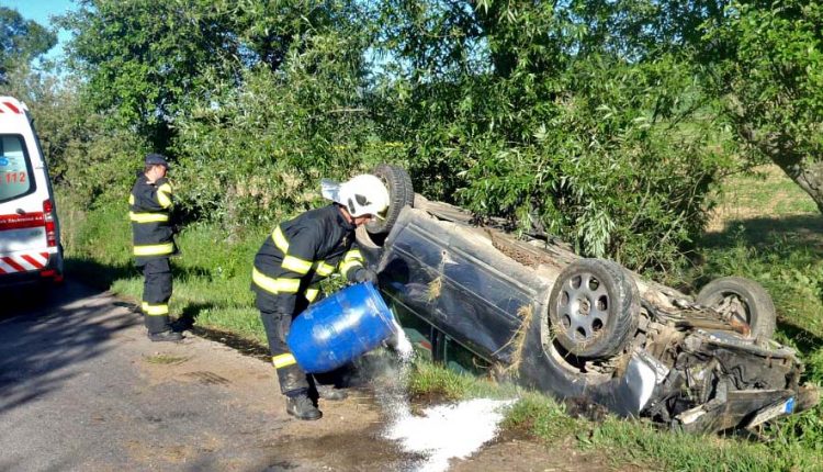 Auto po nehode skončilo vedľa cesty a na streche