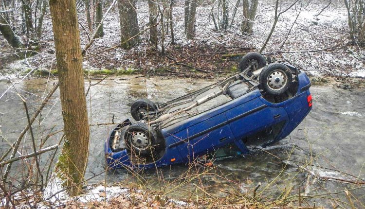 Auto skončilo v potoku a prevrátené na streche