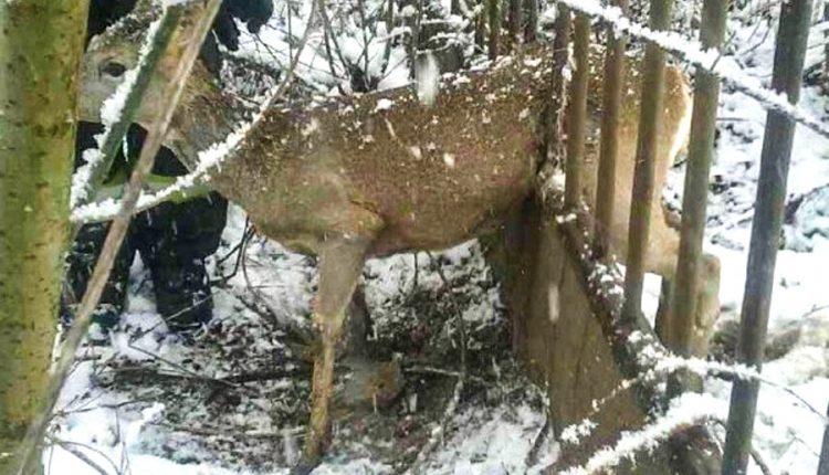 Pri príchode na miesto udalosti hasiči zistili, že srnka zostala zadnou časťou tela zakliesnená v železnej bráne.