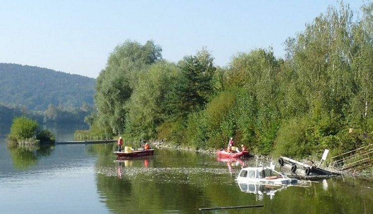 Potopený remorkér na rieke Váh neďaleko Púchova