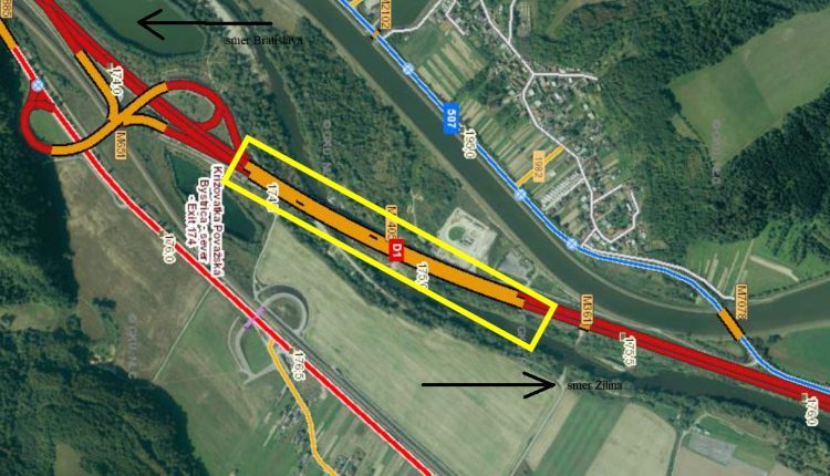 Doprava bude vedená v ľavom jazdnom páse (t. j. od Žiliny do Bratislavy) 2 pruhy + 1 jazdný pruh protismer, a v pravom jazdnom ( od Bratislavy do Žiliny) páse bude zachovaný 1 jazdný pruh. Dopravné obmedzenie bude trvať v termíne do 18,00 h dňa 08. 11. 2023. S cieľom zaistenia bezpečnosti a plynulosti cestnej premávky žiadame účastníkov cestnej premávky o rešpektovanie dočasného dopravného značenia a sledovanie situácie v cestnej premávke.