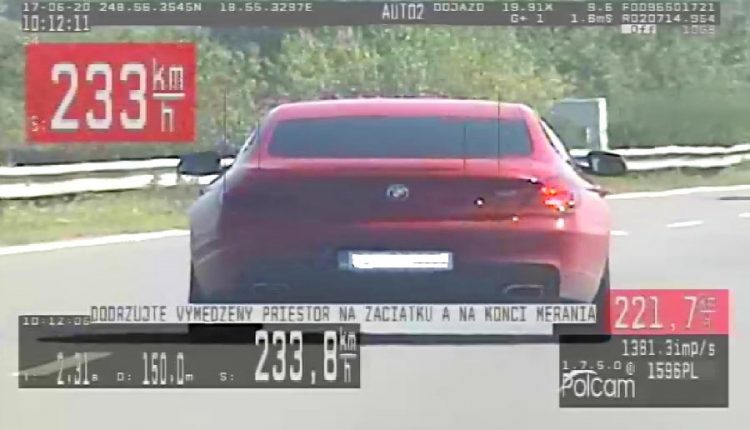 Prvého a aj najrýchlejšieho vodiča policajti radarom Polcam namerali dopoludnia na diaľnici v smere jazdy od Bratislavy na Žilinu. 27- ročnému Jakubovi zo Žiliny na vozidle BMW 640 d policajti namerali na diaľnici D1 rýchlosť jazdy až 233 km/hodinu (viď foto). Vodič BMW prekročil maximálnu povolenú rýchlosť na diaľnici o 103 km/hod. Vodiča následne predpísaným spôsobom zastavili. Pri kontrole bol vodič vyzvaný, k predloženiu dokladov potrebných k vedeniu vozidla a následne, aby sa podrobil dychovej skúške na zistenie prítomnosti alkoholu v dychu. U 27-ročného Jakuba bola dychová skúška negatívna. Za prekročenie maximálnej povolenej rýchlosti na diaľnici diaľniční policajti vodičovi uložili najvyššiu možnú blokovú pokutu, akú je možné uložiť na mieste a to 800 €. Vodič si bol spáchania priestupku vedomý. Uviedol, že sa ponáhľa na súdne pojednávanie.